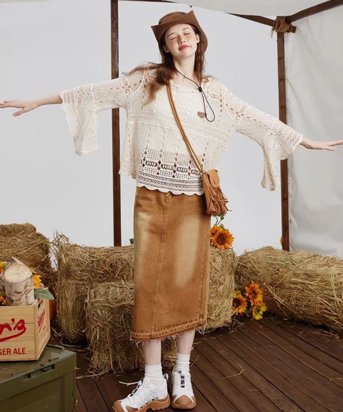 Áo len croptop hiện đại kết hợp với chân váy maxi sẽ giúp bạn hack chiều cao đáng kể. Set đồ này thích hợp cho những buổi đi chơi cuối tuần hoặc du lịch mùa thu. Đừng quên mix thêm giày búp bê hoặc sandal cao gót để tổng thể thêm ấn tượng.