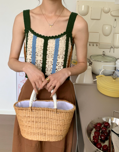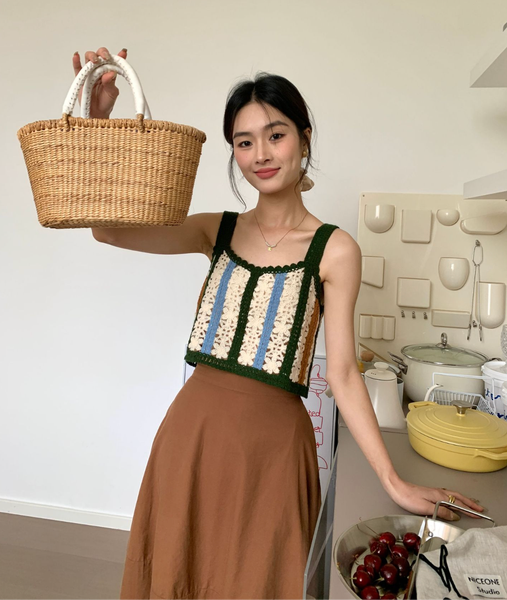 Kết hợp với chân váy dài boho và túi cói để hoàn thiện phong cách vintage.