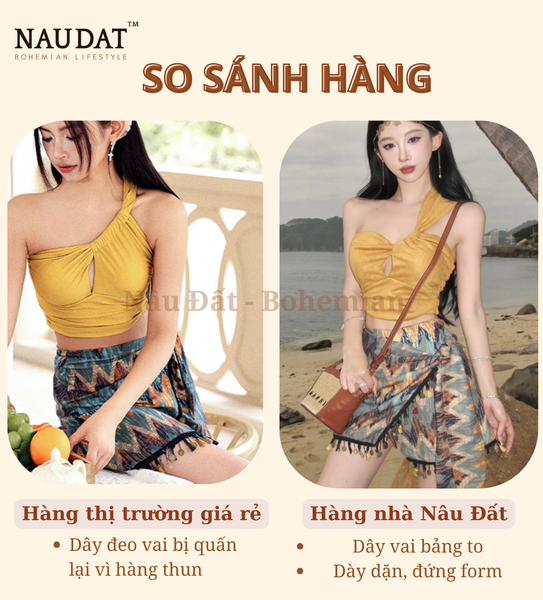 - Áo crop top: Kiểu dáng quây ngực phá cách với chi tiết cut-out tinh tế, ôm sát đường cong cơ thể nhưng vẫn tạo sự thoải mái. Dây đeo cổ lệch vai độc đáo, tôn lên nét quyến rũ và cá tính.