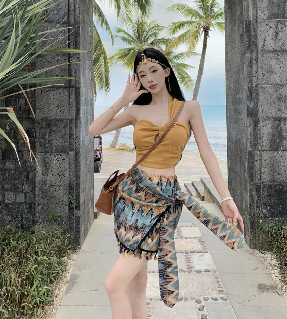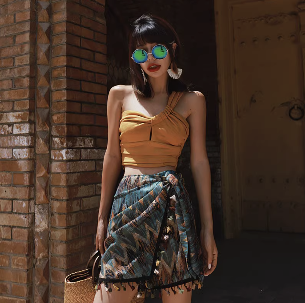• Chân váy quấn họa tiết tribal: Lấy cảm hứng từ các hoa văn thổ dân du mục, chiếc váy này mang đến vẻ đẹp phóng khoáng và đầy nghệ thuật. Phần viền tua rua tinh tế không chỉ làm tăng vẻ mềm mại mà còn tạo hiệu ứng chuyển động uyển chuyển khi bước đi.