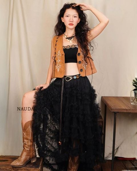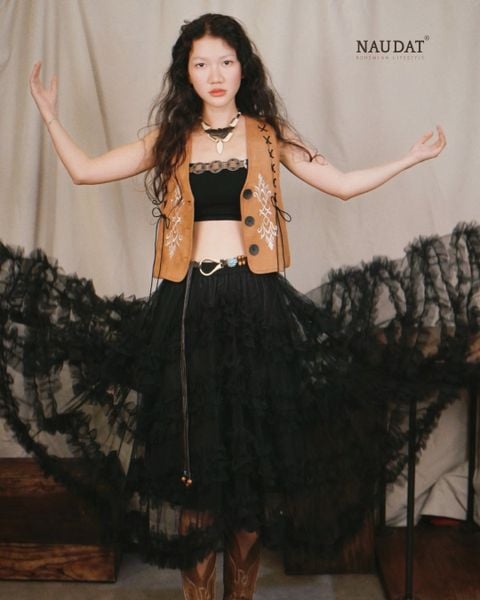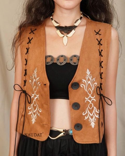 Lấy cảm hứng từ những cô gái du mục phóng khoáng giữa thảo nguyên rộng lớn, Áo Gile Da Lộn Cúc Đen mang đến vẻ đẹp vừa bụi, vừa mềm mại. Các đường thêu đối xứng kết hợp chi tiết buộc dây độc đáo tạo nên nét cá tính đầy nghệ thuật – một điểm chạm tinh tế cho outfit Boho của nàng.