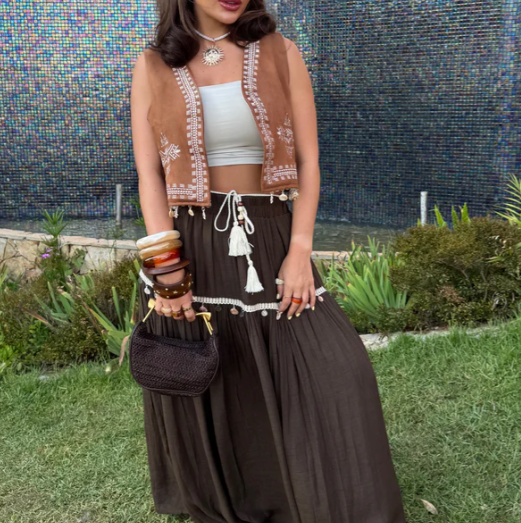 Mix với quần jeans ống rộng, chân váy midi hoặc đầm linen dài để tạo outfit du mục hiện đại