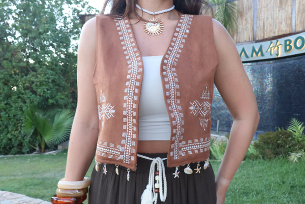 Lấy cảm hứng từ hình ảnh nàng Boho tự do giữa nắng vàng và gió cao nguyên, Áo Gile Da Lộn Đính Sò mang đến vẻ đẹp phóng khoáng nhưng vẫn đầy nữ tính. Từng đường nét và chi tiết đính sò nhỏ xinh như những âm thanh tí tách của gió, gợi lên cảm giác gần gũi, tự nhiên và đầy nghệ thuật.