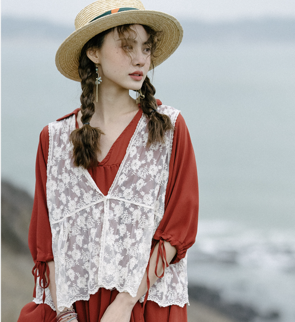Áo gile ren phối hoạ tiết mềm mại, phóng khoáng mà tinh tế. Thiết kế không tay, layer cùng đầm dài hay áo thun đều rất xinh, tạo điểm nhấn nhẹ nhàng cho outfit Bohemian.