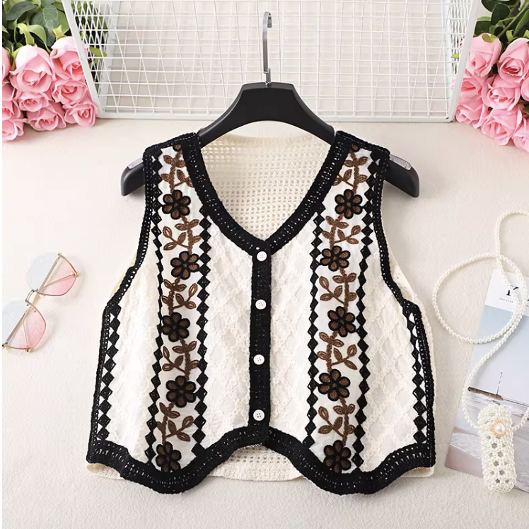 Chiếc áo gile đan tay thêu hoa nổi bật với những tông màu đất trầm ấm – một điểm nhấn dịu dàng mang tinh thần vintage pha chút retro, rất đặc trưng của phong cách boho chic.
