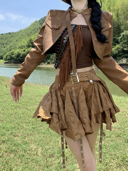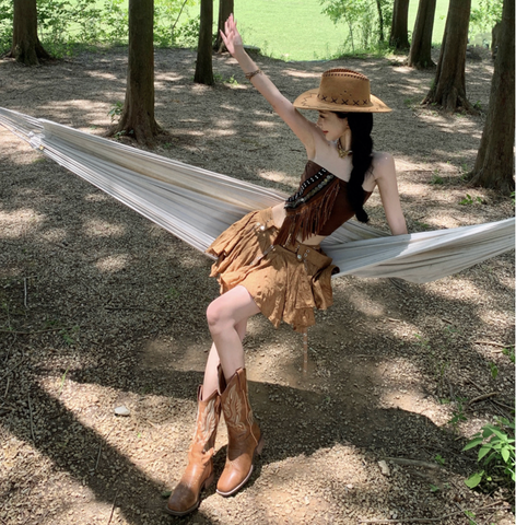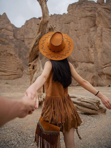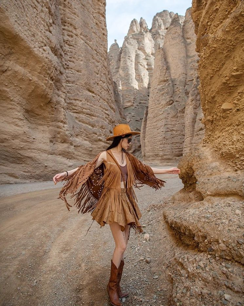 - Mix cùng áo khoác da lộn, mũ cowboy và boots cao cổ để hoàn thiện outfit miền viễn Tây độc đáo.