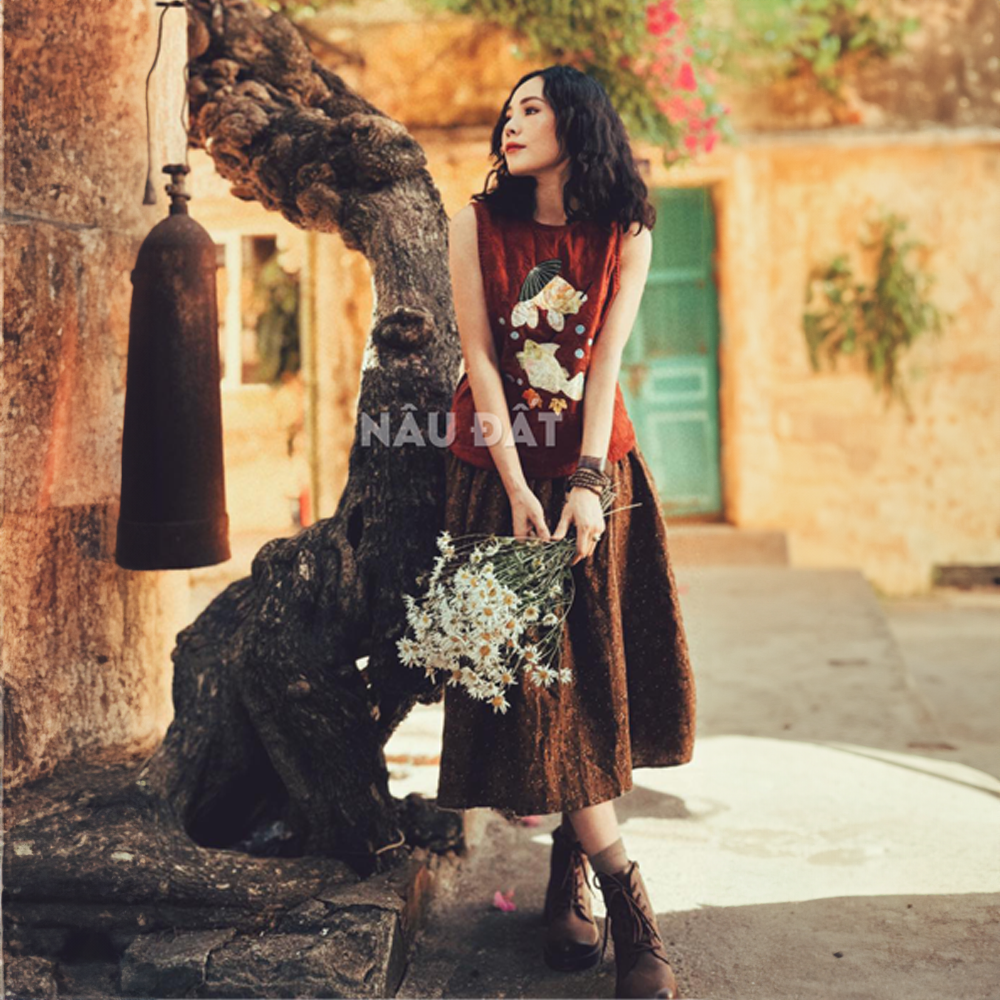 Callia được NAUDAT lấy cảm hứng từ những ngày nắng vàng ươm trên cao nguyên. Đó là lúc các chị ngồi bên hiên nhà, thưởng thức tách trà, ngắm nhìn cảnh vật bình yên xung quanh. Những bông hoa nhí trên nền vải nâu như gợi lên hình ảnh đồng cỏ hoang sơ, nơi mà từng chi tiết nhỏ đều tràn đầy sức sống. Chiếc váy chính là lời mời các chị về với thiên nhiên, tận hưởng vẻ đẹp tự do và phóng khoáng.
