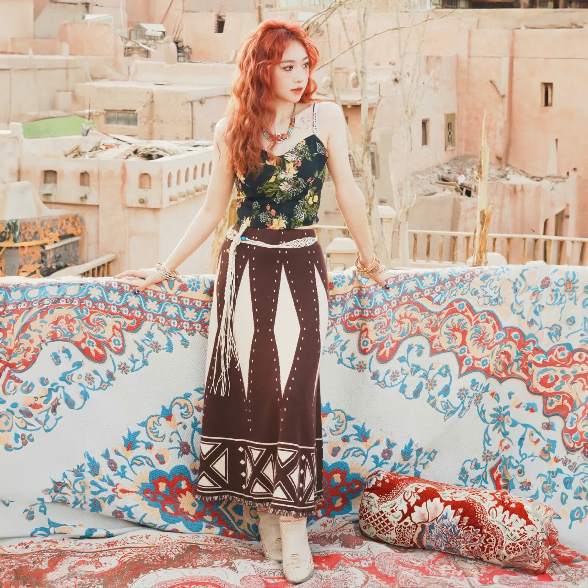 Chân váy len Bohemian nâu đất nữ dáng dài thời trang thu đông