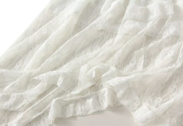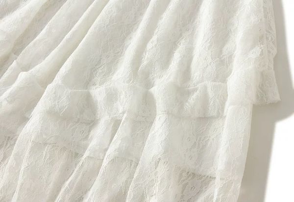 Tầng ren xếp lớp bất đối xứng, tạo hiệu ứng bồng bềnh, mềm mại, tôn lên sự nữ tính.