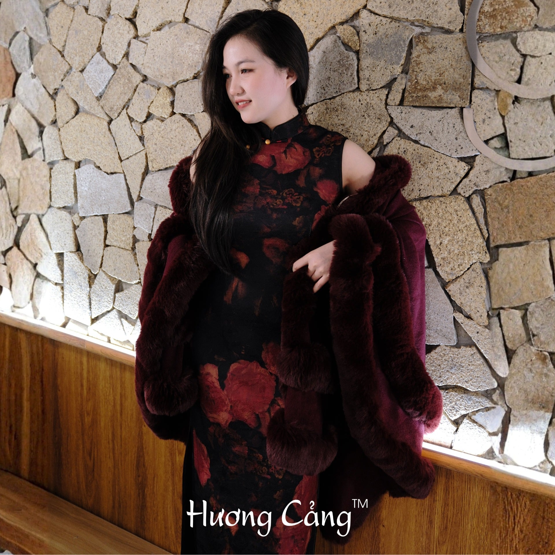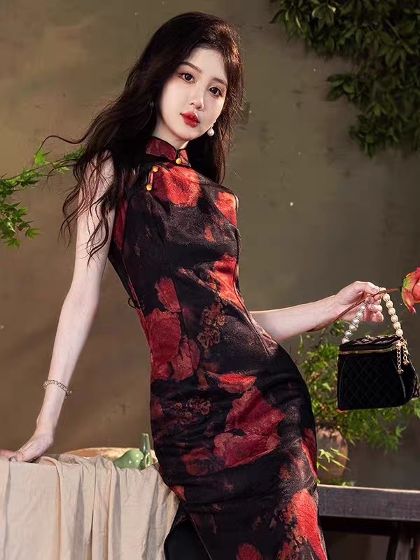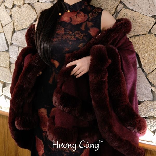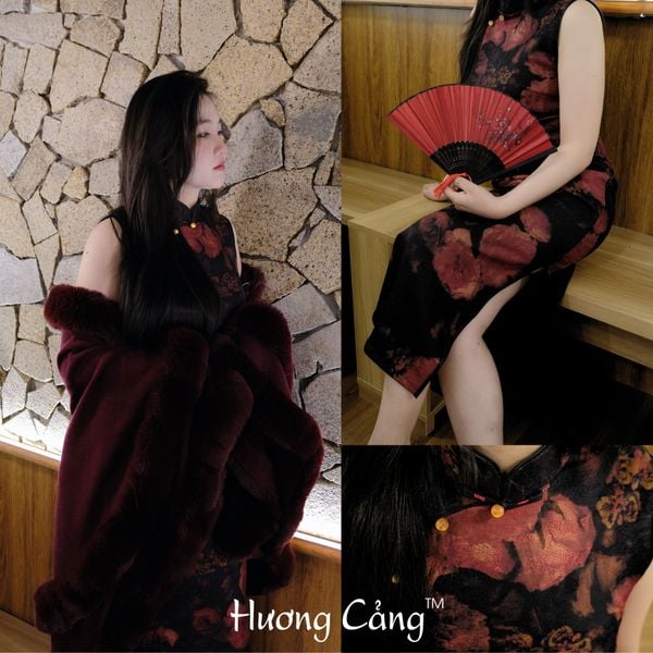 Nền vải đen huyền kết hợp họa tiết hoa đỏ thẫm như ánh lửa trong đêm, tạo nên một tổng thể vừa quyến rũ, vừa mang khí chất cổ điển rất riêng.