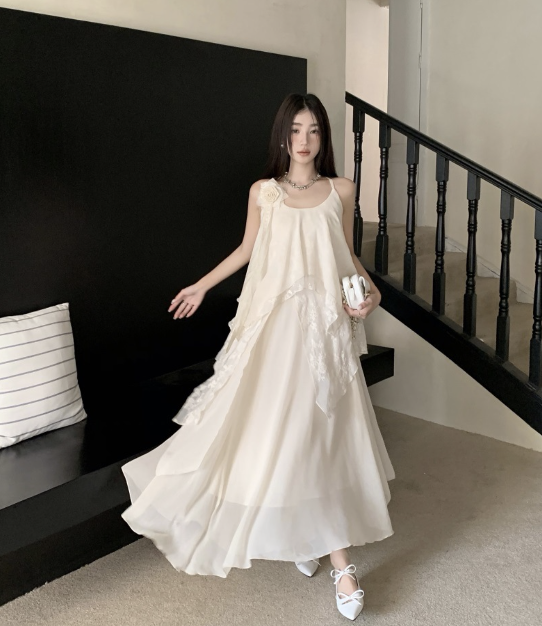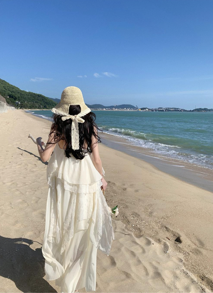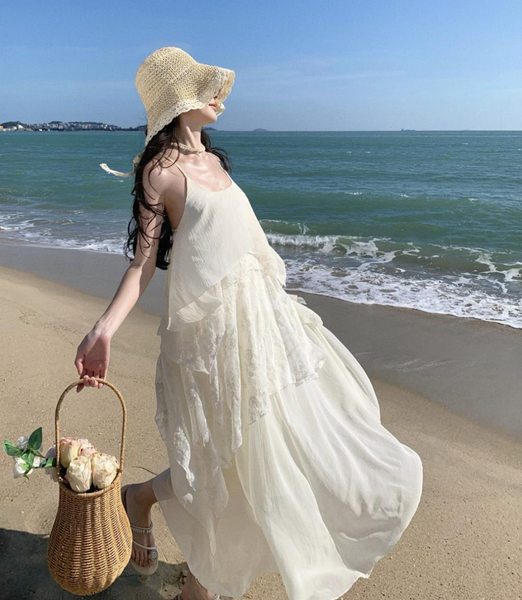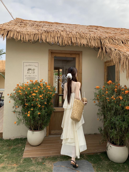 Màu kem (trắng ngà) thanh lịch, dễ dàng phối hợp cùng các phụ kiện boho như mũ cói, túi đan hoặc sandal dây mảnh.