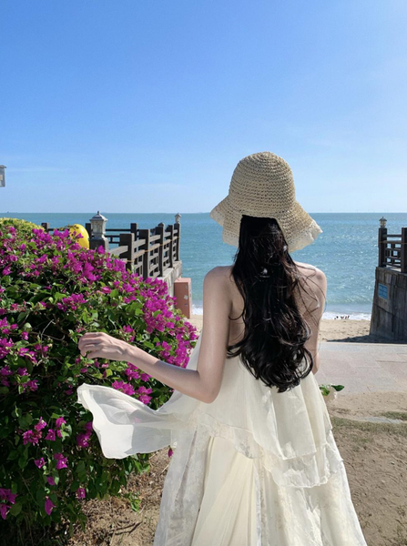 - Phần lưng hở tạo điểm nhấn quyến rũ, phù hợp với không gian biển xanh, cát trắng.