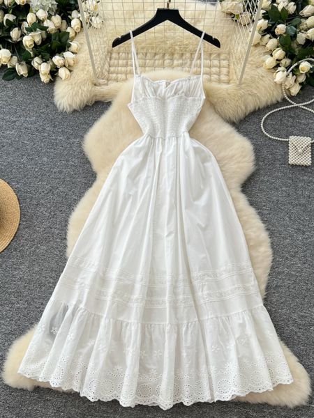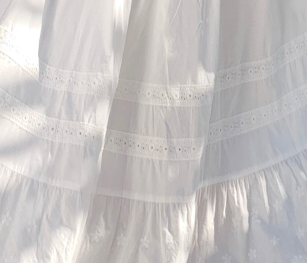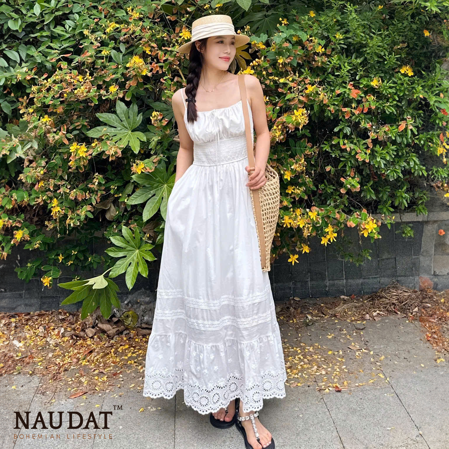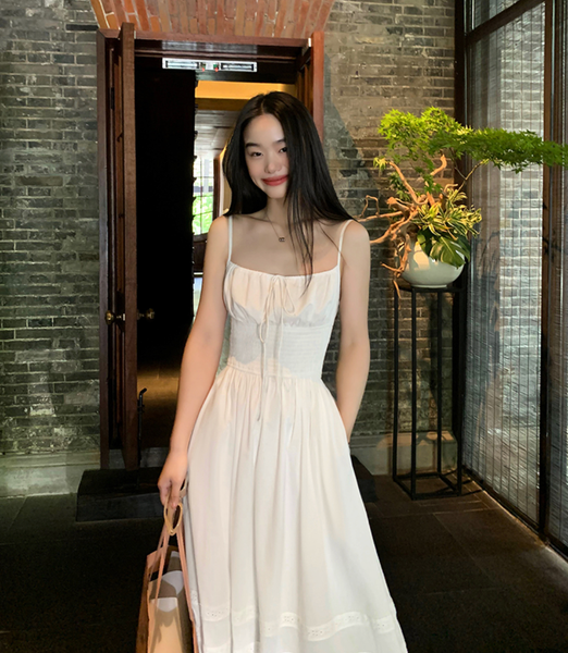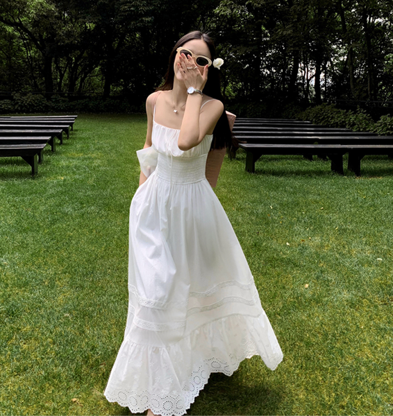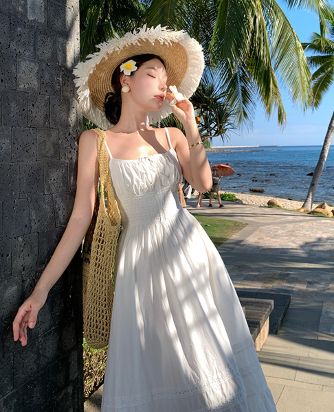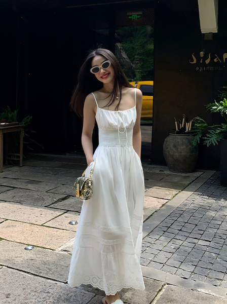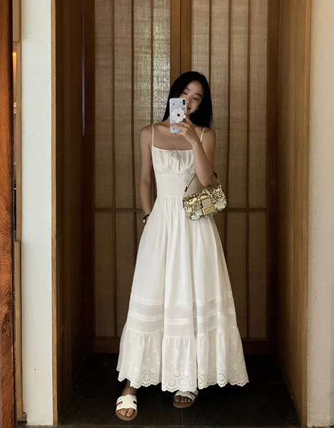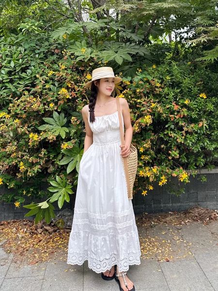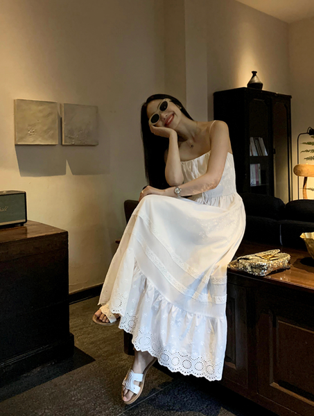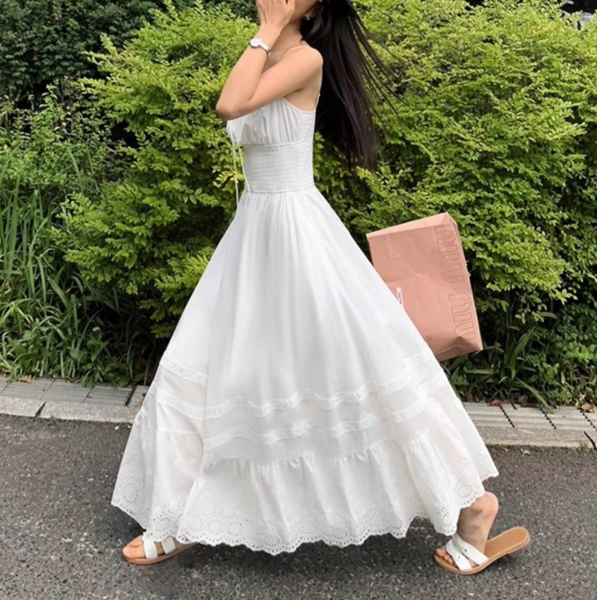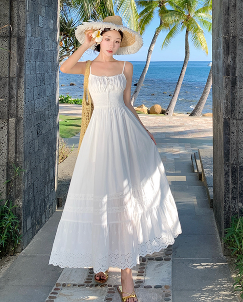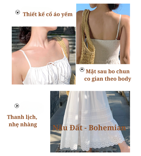 Chiếc đầm được làm từ vải cotton mềm mại, thoáng mát, giúp làn da luôn được “hít thở” trong những ngày hè oi ả. Phần eo được chiết nhẹ, tôn lên vẻ nữ tính, trong khi chân váy có những họa tiết ren tinh xảo, tạo cảm giác lãng mạn và thơ mộng. Kiểu dáng maxi thướt tha khiến mỗi bước đi đều trở nên duyên dáng hơn, đặc biệt khi gió biển thổi nhẹ, tạo hiệu ứng bay bổng đầy cuốn hút.
