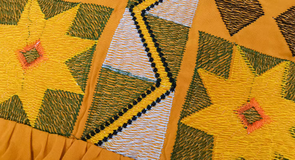 Họa tiết thêu tinh xảo trên ngực và tay áo, lấy cảm hứng từ các hoa văn thổ cẩm truyền thống, tạo điểm nhấn nghệ thuật độc đáo.