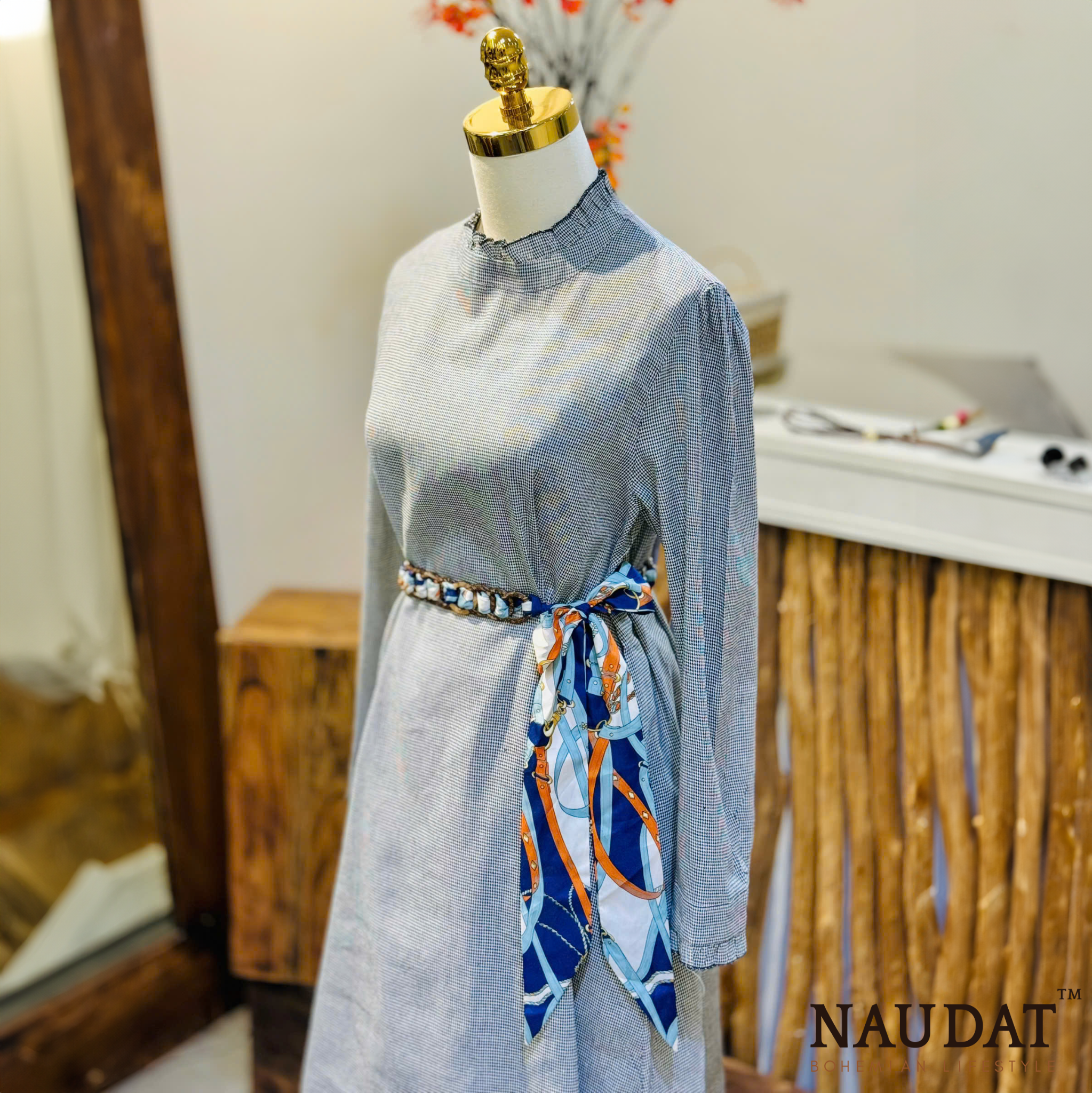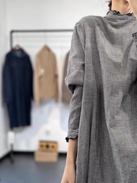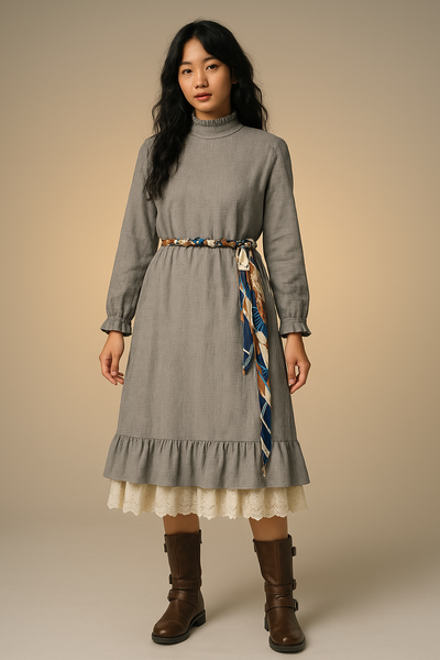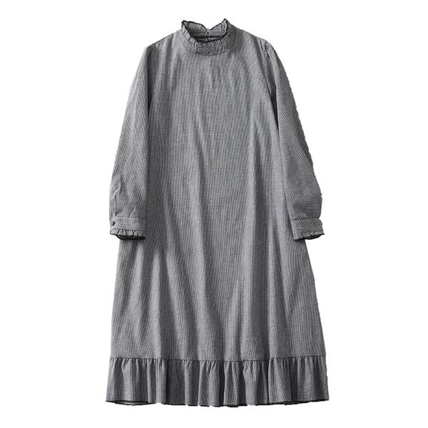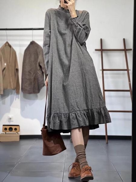 Chiếc đầm được may từ chất vải ô vuông nhỏ màu xám tro, một gam màu trung tính nhưng không hề nhạt nhòa. Các đường dệt tinh tế tạo nên bề mặt vải nhẹ nhàng, mềm mại nhưng vẫn đủ độ đứng phom để mang lại sự thanh lịch. Phần cổ cao viền ren và tay dài bo nhẹ làm tăng thêm nét vintage cổ điển, như một bản hòa ca của sự giản đơn và tao nhã. Chi tiết bèo nhún ở gấu váy giúp tổng thể trang phục trở nên sinh động hơn, mang hơi thở nhẹ nhàng của phong cách mori girl.