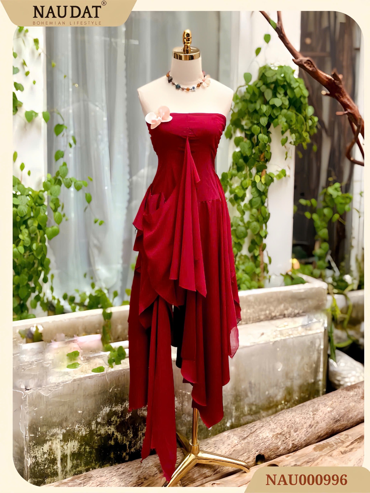 Hóa thân thành nàng thơ giữa khu vườn nhiệt đới cùng mẫu đầm thiết kế đỏ boho độc bản từ NAUDAT. Chiếc đầm được may trên nền voan lụa mềm nhẹ, mang sắc đỏ rượu vang quyến rũ – không chỉ giúp tôn da mà còn thể hiện khí chất tự do, bay bổng của nàng Bohemian hiện đại.