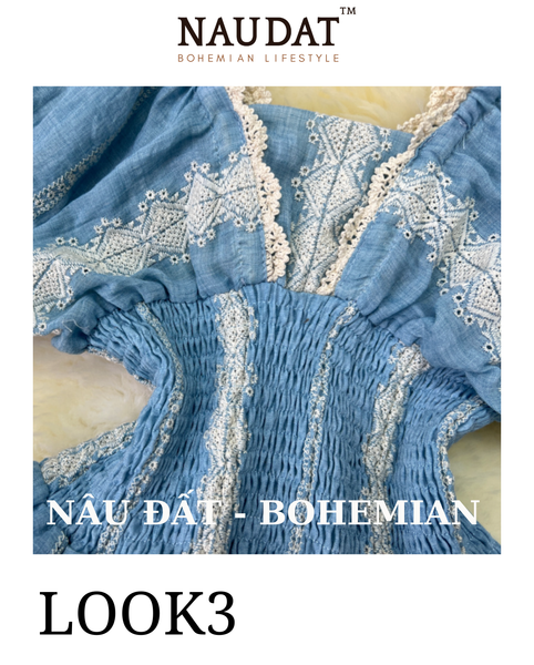 Đường ren thêu tinh xảo chạy dọc thân váy, tạo nên vẻ đẹp vintage pha lẫn sự phóng khoáng Boho.