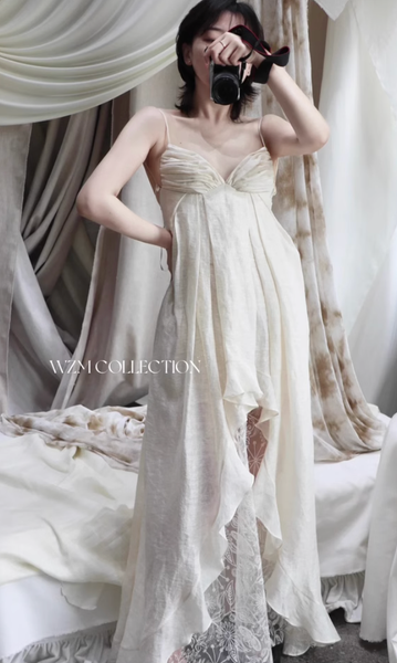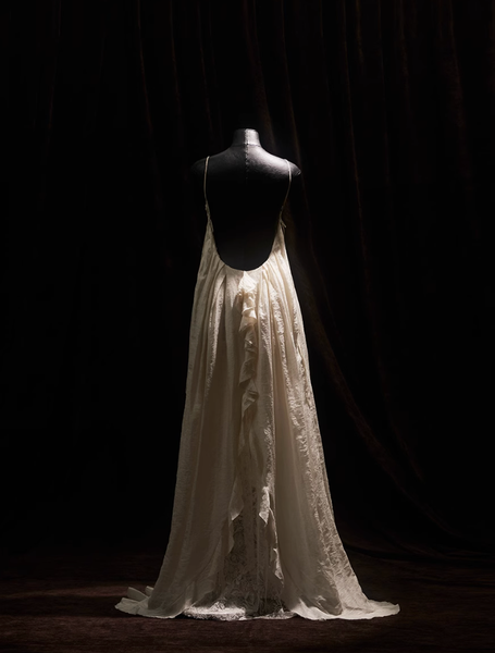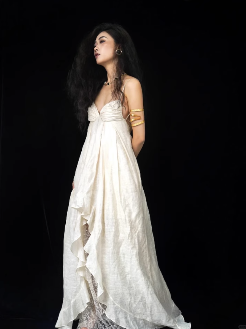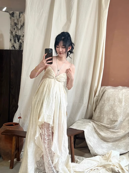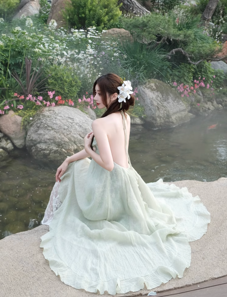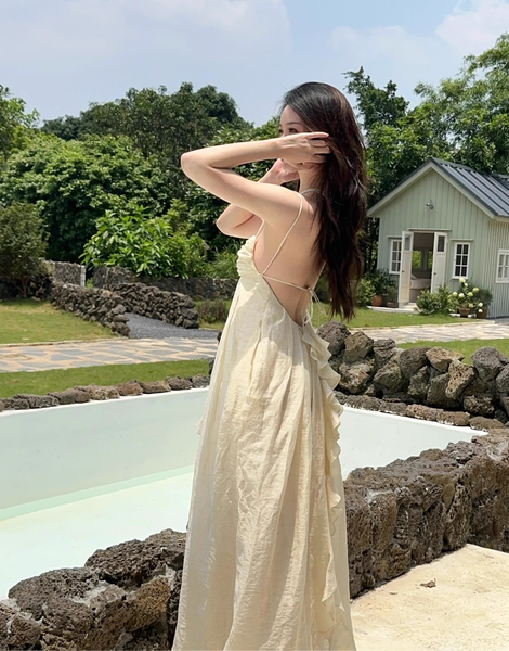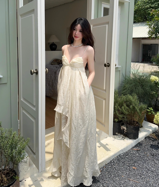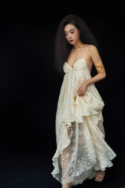 Dáng đầm hai dây với phần lưng hở chính là điểm nhấn đầy quyến rũ nhưng không hề phô trương. Những đường xếp nếp mềm mại tựa như làn hơi nước len lỏi qua ánh sáng, tạo nên một sự chuyển động nhẹ nhàng, duyên dáng theo từng bước chân.