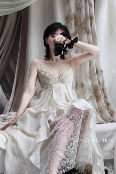 Chi tiết ren nơi gấu váy gợi nhớ đến những tia nắng sớm khẽ chiếu qua màn sương, tạo nên một vẻ đẹp mong manh mà đầy mê hoặc.