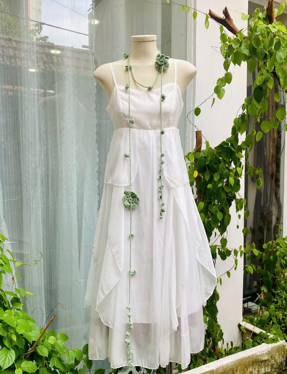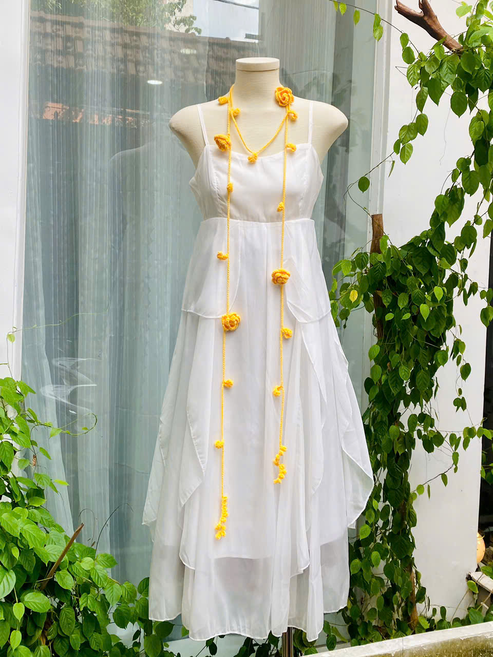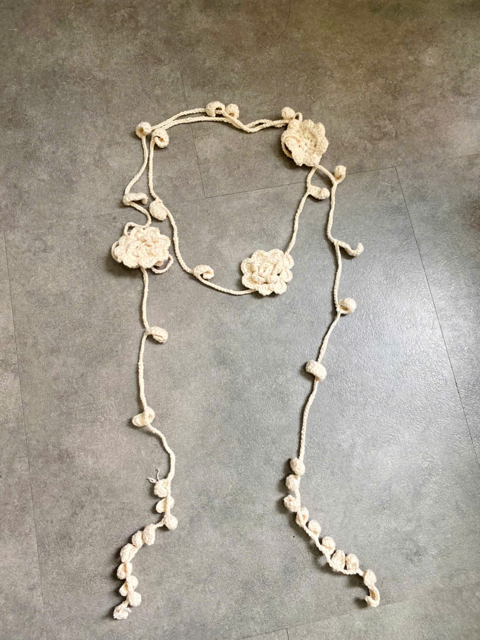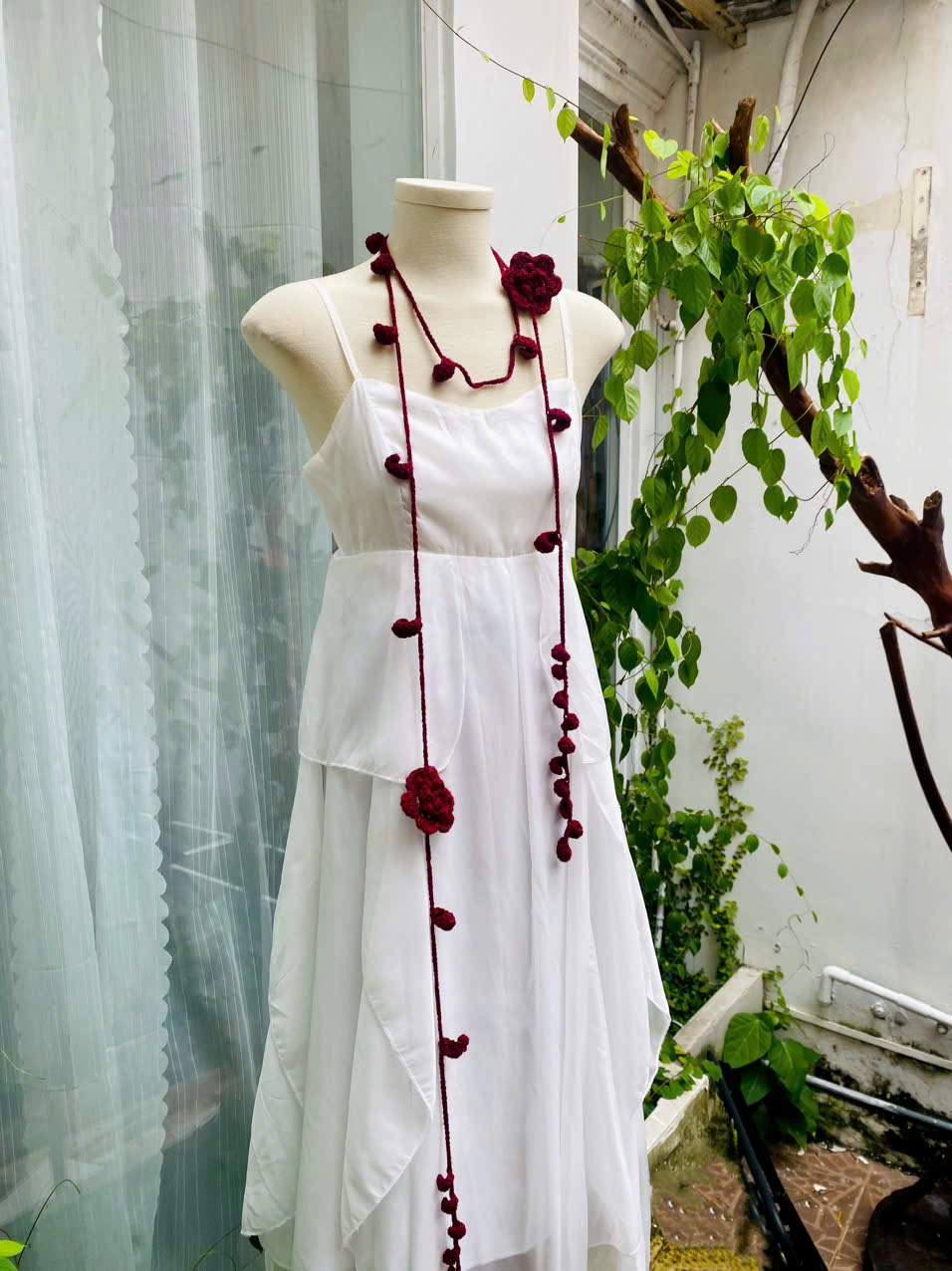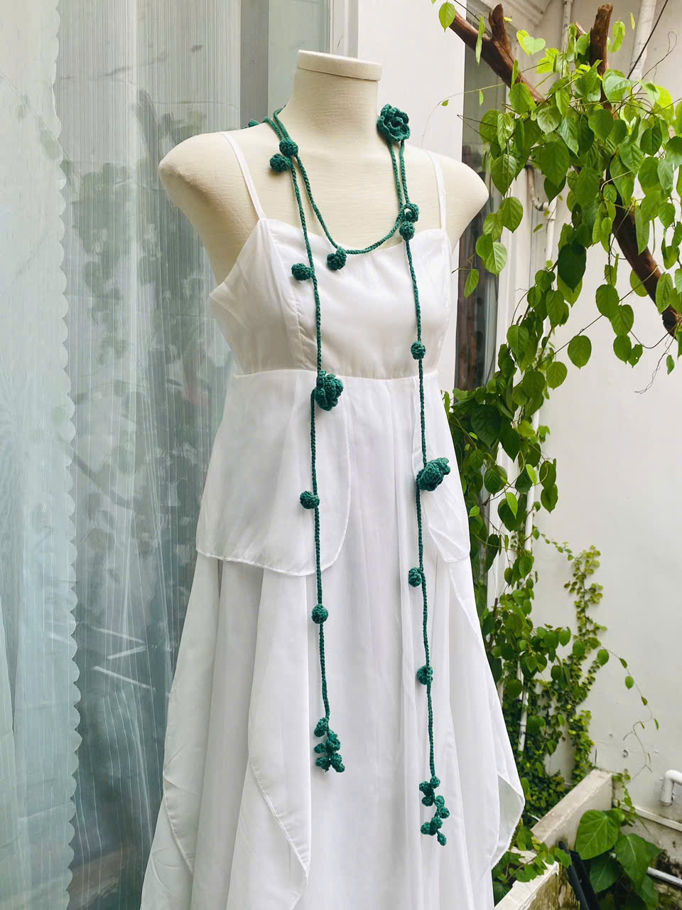 Từng sợi dây được móc tỉ mỉ, điểm xuyết những bông hoa rực rỡ cùng lá nhỏ duyên dáng. Dây len không chỉ là một phụ kiện, mà còn là “nét chấm phá” khiến outfit trở nên thi vị, như bản nhạc giao hòa giữa dịu dàng và cuốn hút.