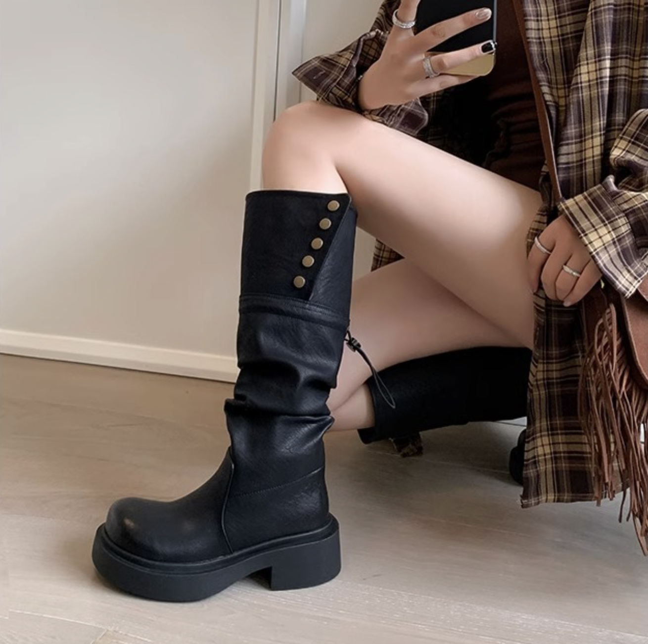 Giày boot nữ chất liệu da PU mềm mại, nổi bật với hàng nút tròn tinh tế dọc thân giày. Thiết kế có thể điều chỉnh phần cổ giày dài-ngắn linh hoạt, phù hợp nhiều phong cách từ năng động đến dịu dàng Boho.