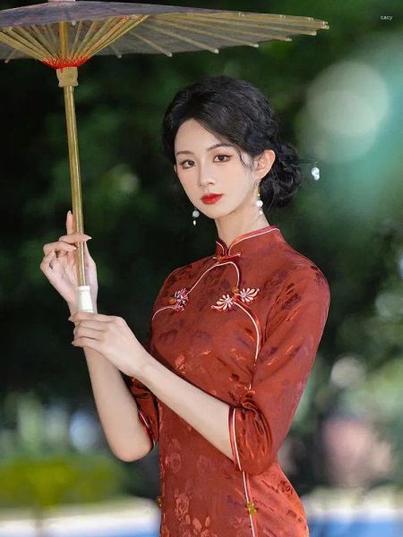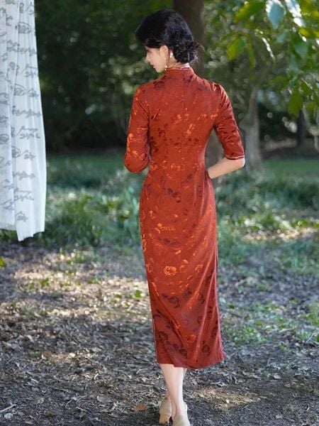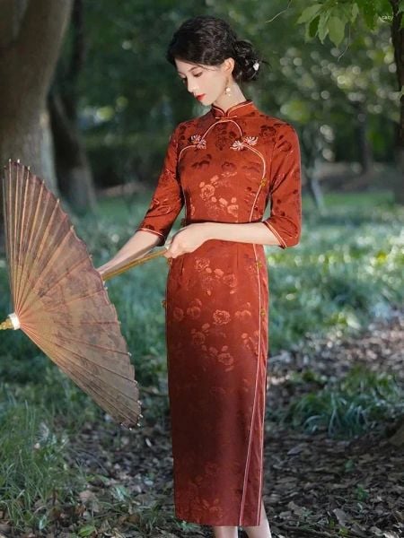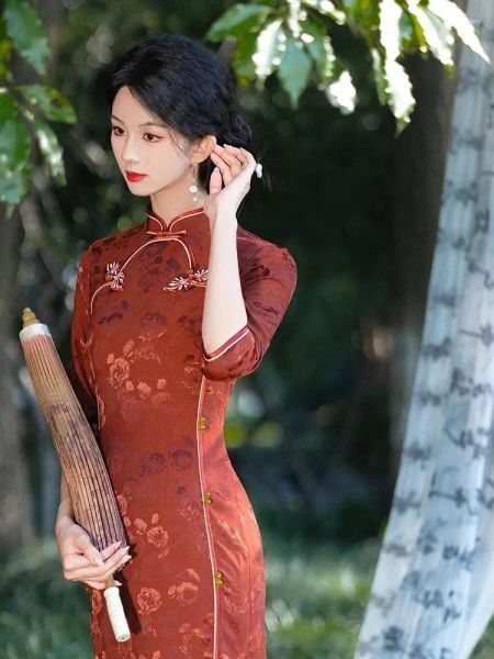 Lấy cảm hứng từ hình ảnh người phụ nữ Á Đông dịu dàng giữa khu vườn tĩnh lặng, Huyền Hoa mang nét đẹp trầm mặc, kín đáo nhưng đầy cuốn hút. Gam màu đỏ nâu cổ điển hòa quyện cùng họa tiết hoa chìm tinh tế, gợi nên vẻ đẹp sang trọng, sâu lắng và rất đỗi nữ tính.