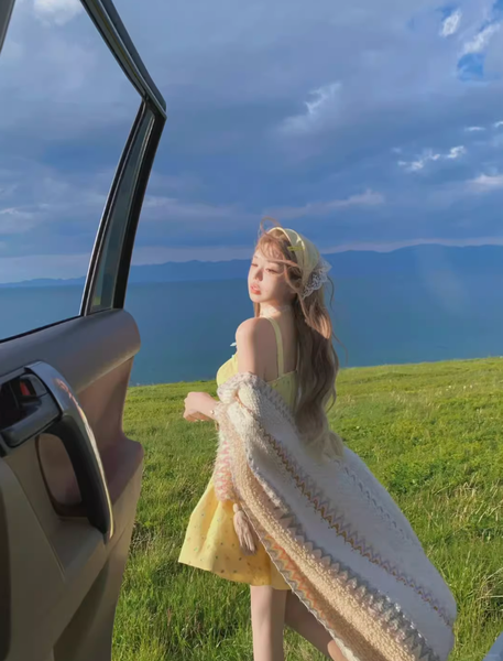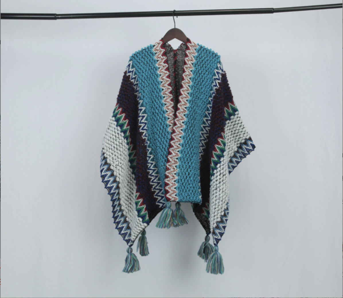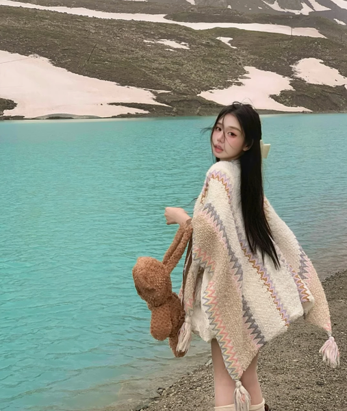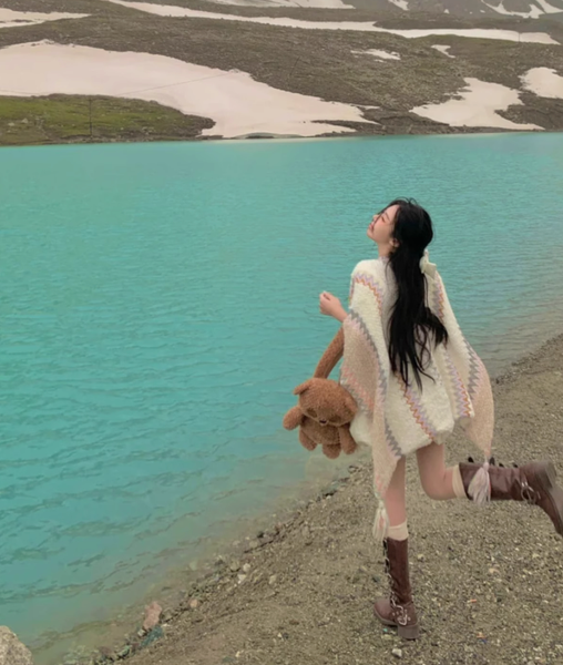 Chiếc áo poncho này không chỉ là một món trang phục, mà còn là linh hồn của tự do và sáng tạo. Với gam màu xanh dịu mát của bầu trời, sắc trắng của mây và những đường chỉ màu rực rỡ như ánh nắng thảo nguyên, tấm áo mang đến cảm giác vừa bình yên, vừa nổi bật giữa không gian thiên nhiên hùng vĩ.