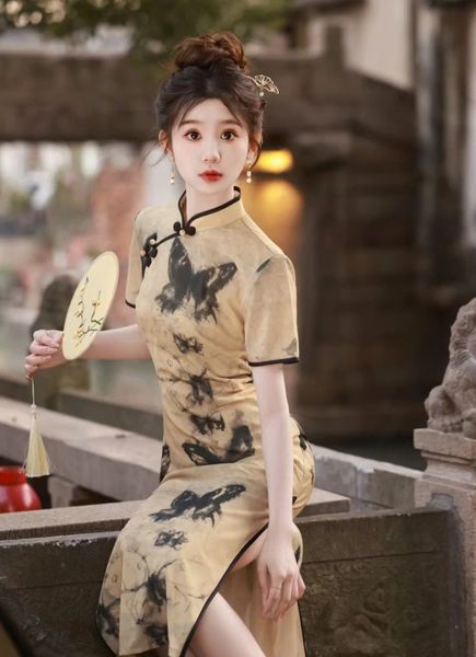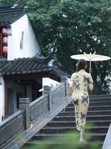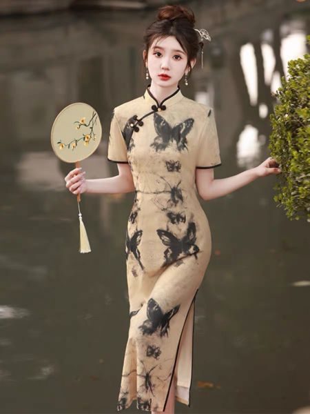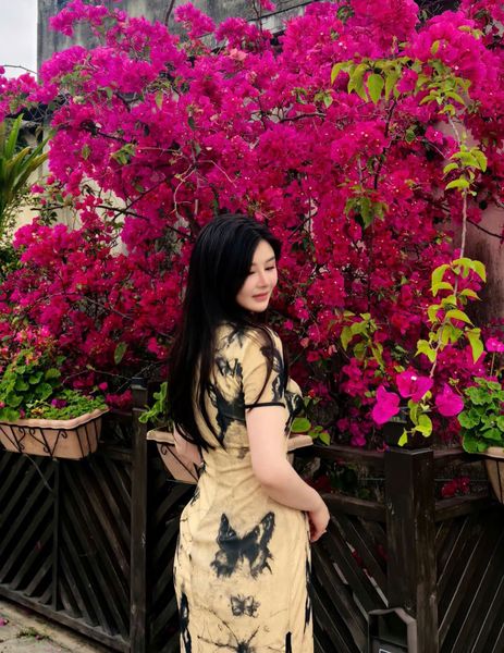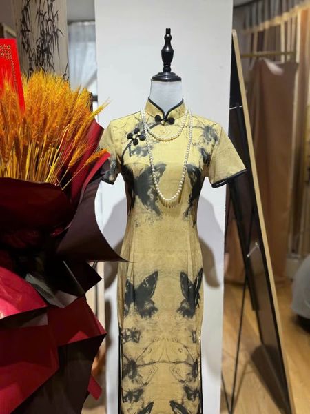 Mạc Vũ gợi cảm giác như một trang thư cổ đã ngả màu theo năm tháng, nơi những cánh bướm mực đen khẽ đậu lại, in dấu thời gian một cách dịu dàng. Không rực rỡ, không phô trương, mẫu sườn xám này cuốn hút bằng vẻ đẹp hoài niệm, tinh tế và đầy khí chất Á Đông.