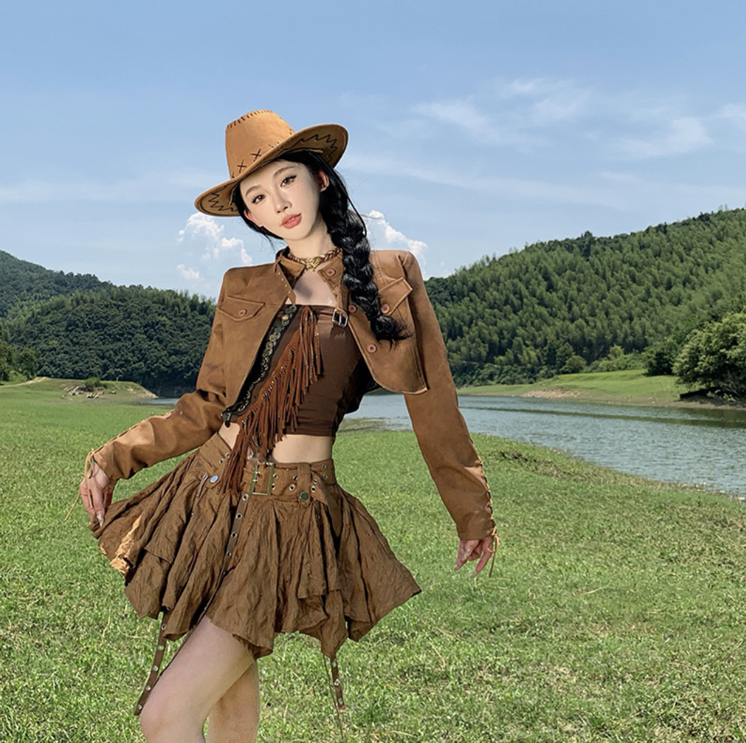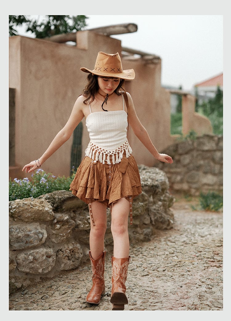 - Mix cùng áo khoác da lộn, mũ cowboy và boots cao cổ để hoàn thiện outfit miền viễn Tây độc đáo.