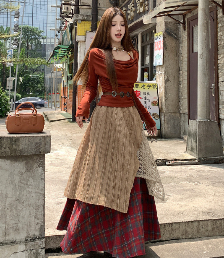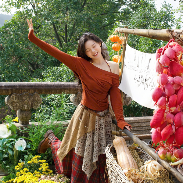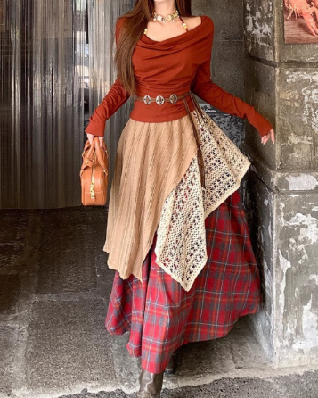 Set Bohemian độc đáo gồm áo cổ đổ màu cam đất, chân váy phối caro cùng các chi tiết ren đan, kết hợp với thắt lưng da lộn tua rua tạo nên vẻ đẹp tự do, hoang dã và đầy nữ tính.