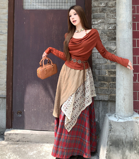 • Váy: Vải dệt len phối caro, kết hợp ren cotton và chất liệu linen tạo sự thoải mái.