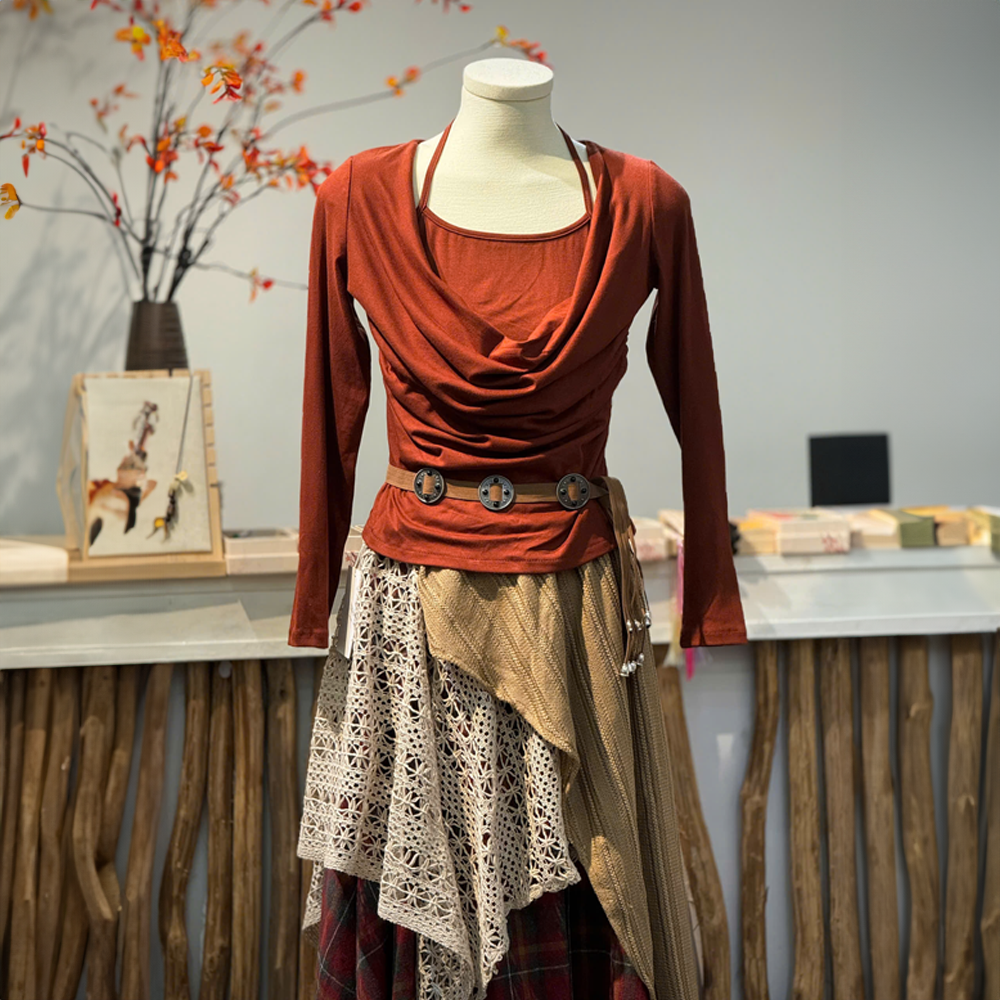 Lấy cảm hứng từ những sắc màu của mùa thu Tây Nguyên, set váy Selina như một bản hòa ca của thiên nhiên, nơi đất đỏ bazan hòa quyện với nắng vàng và những cơn gió mang hương vị tự do.