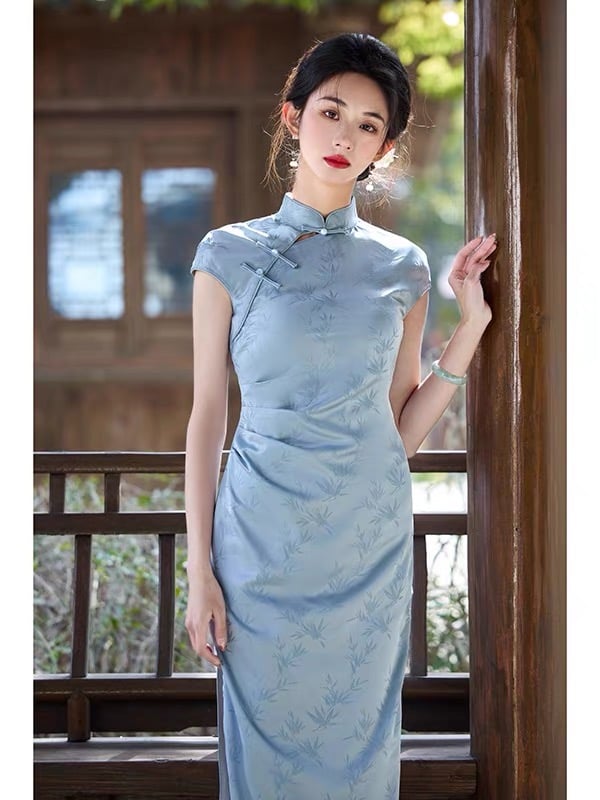 Lấy cảm hứng từ hình ảnh hàng trúc mảnh mai trong làn sương mỏng, Trúc Sương mang vẻ đẹp nhẹ nhàng, trong trẻo và rất Á Đông. Gam màu xanh nhạt – xanh ngọc dịu mắt kết hợp cùng họa tiết hoa chìm tinh tế, tạo nên tổng thể thanh thoát, kín đáo nhưng đầy khí chất.